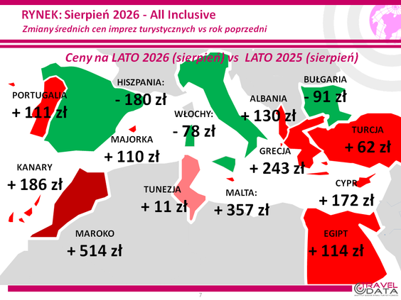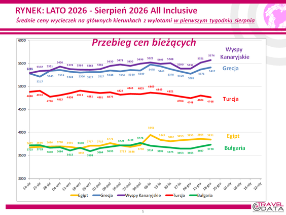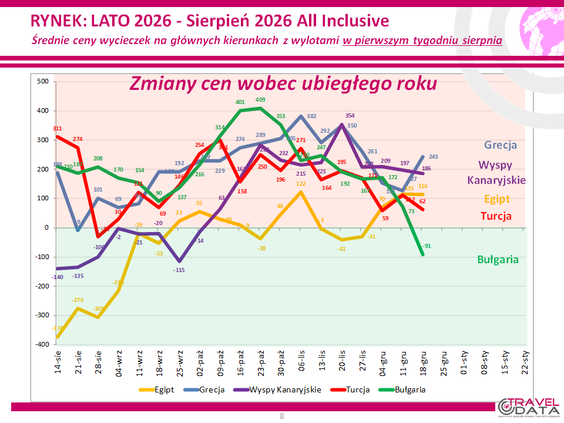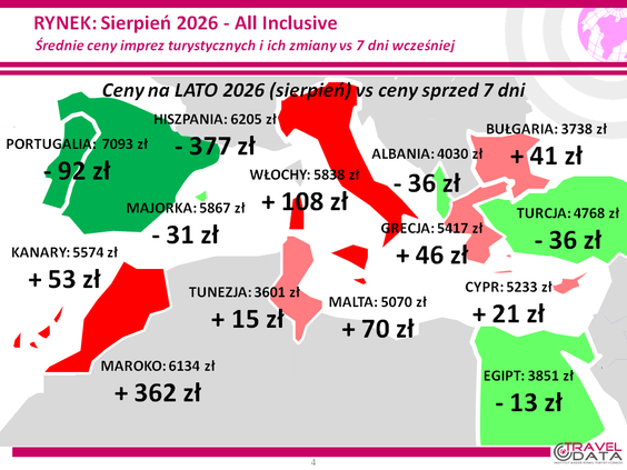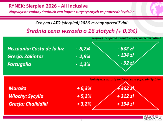 W ostatnim tygodniu średnia cena wycieczki z wylotem między 3 a 9 sierpnia 2026 roku wzrosła o 16 złotych – czytamy w najnowszym raporcie, jaki co tydzień sporządza na podstawie przeglądu tysięcy ofert biur podróży Instytut Badań Rynku Turystycznego Traveldata.
