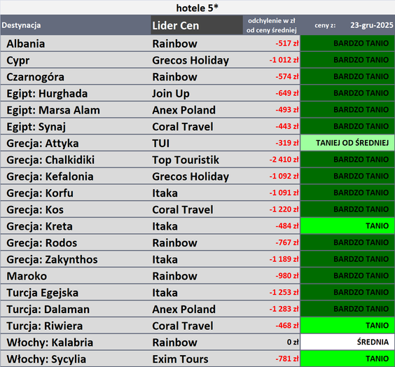 Największą zniżkę cen w ostatnim tygodniu Traveldata odnotowała w wypadku Dalamanu – o 199 złotych. Nieco mniej spadły ceny wakacji na Korfu i na Costa del Sol – o 157 i 115 złotych. Z kolei największy wzrost średnich cen objął wycieczki na Sardynię, o 158 złotych, do Maroka, o 84 złote, i do Kalabrii – o 69 złote.