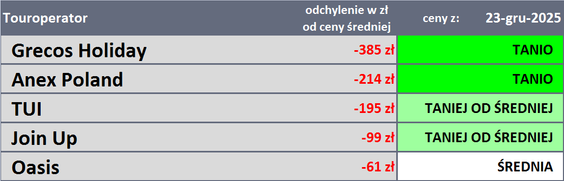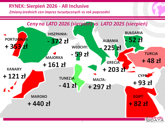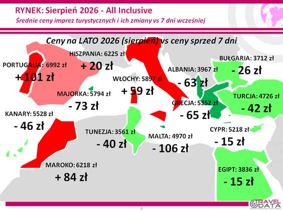 Zmiany średnich cen w ostatnim tygodniu obrazują graficzne zestawienia przygotowane przez Traveldatę.