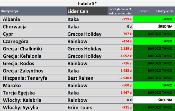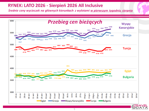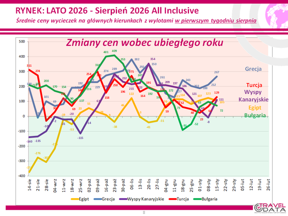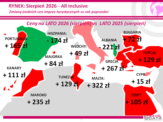 Największą zniżkę cen w ostatnim tygodniu Traveldata odnotowała w ofertach biur podróży wakacji na Półwyspie Chalcydyckim (poprzednio był tam duży wzrost cen) – o 435 złotych. Znacząco mniejsze spadki były udziałem cen wyjazdów do Portugalii i na Maltę – o 159 i 138 złotych.