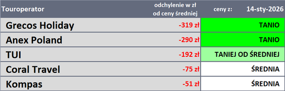 Taka zmiana jest w skali cen wyjazdów znikoma. W dodatku niweluje tylko minimalny wzrost z poprzedniego tygodnia średniej ceny, który wyniósł 89 złotych. A jak średnie ceny zmieniały się w poprzednich tygodniach? Cena wzrosła o 18 złotych, spadła o 37 złotych, rosła o 16 i o 80 złotych, malała o 14, 47, 30 i 10 złotych, rosła o 40, 2 i 17 złotych, spadła o 3 złote, rosła o 28, 2 i 17 złotych i spadła o 22 i o 28 złotych.