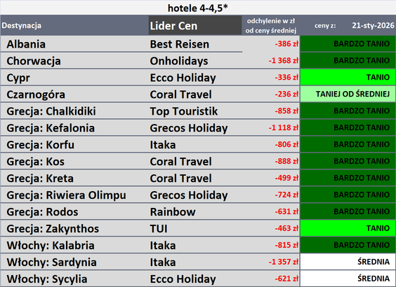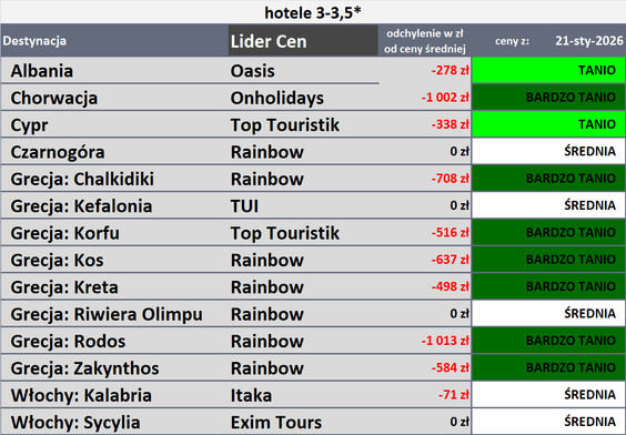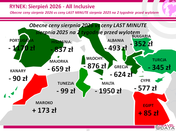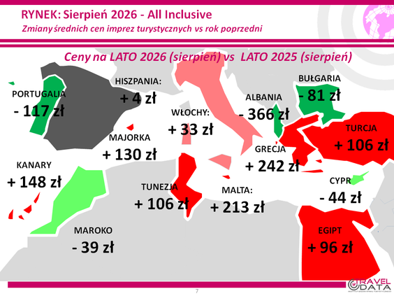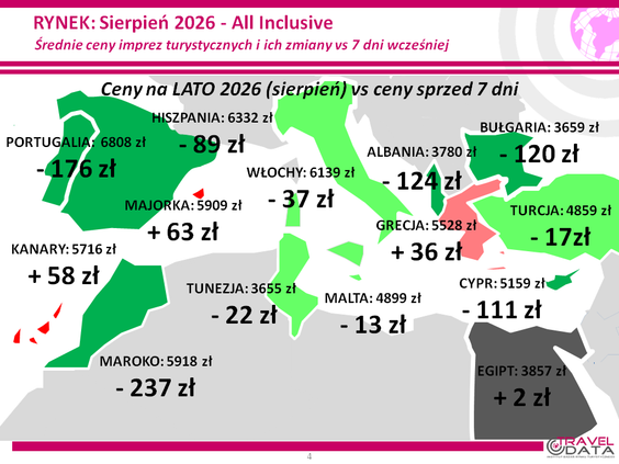 Największy wzrost średnich cen wycieczek wskazali natomiast na Półwyspie Chalcydyckim (poprzednio był tam największy spadek cen), o 196 złotych, na Teneryfie, o 155 złotych, i na Sardynii – o 64 złotych.