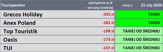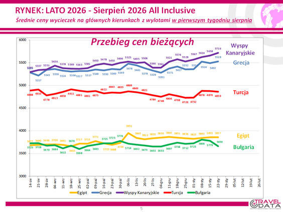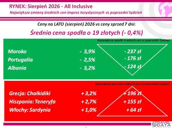 W minionym tygodniu, średnia cena dla wycieczek z wylotami pomiędzy 3 i 9 sierpnia 2026 spadła o 19 złotych – wskazuje Instytut Badań Rynku Turystycznego Traveldata*. Można uznać, że to druga z rzędu niewielka korekta (poprzednia wyniosła minu 12 złotych), po tym jak średnia cena wzrosła dwa tygodnie temu o 89 złotych.