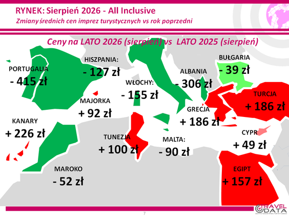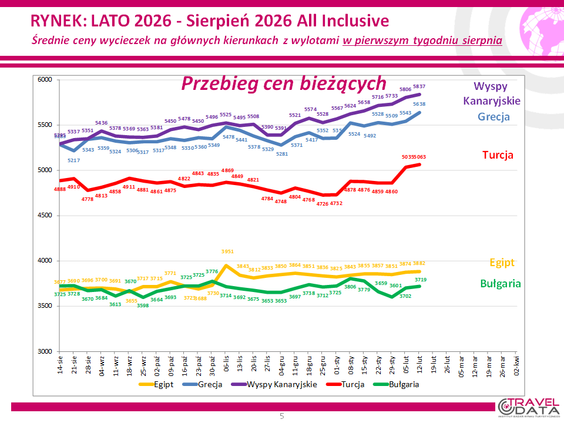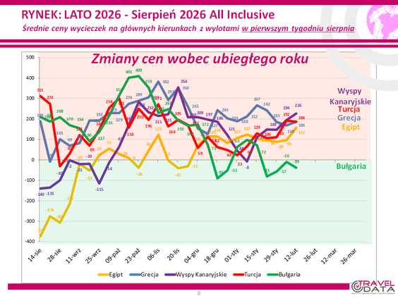 *Opracowanie obejmuje porównanie cen wyjazdów z wylotem w wysokim sezonie letnim 2026 roku, definiowanym na potrzeby porównań jako okres pierwszego tygodnia sierpnia, czyli od 3 do 9 sierpnia. Ceny dla tego okresu zostały zebrane 12 lutego 2026 roku i porównane z cenami dla tego samego okresu wylotów zebranymi 5 lutego 2026 roku – w ujęciu tydzień do tygodnia – i z cenami zebranymi 13 lutego 2025 roku w ujęciu rok do roku.