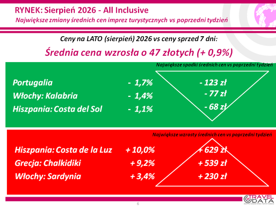Raport zamykają trzy zestawienia ilustrujące, którzy organizatorzy wyjazdów oferowali w zeszłym tygodniu wyjazdy siedmiodniowe, all inclusive, z Warszawy na pierwszy tydzień sierpnia 2026 roku z najlepszymi dla klientów średnimi cenami, czyli takich, „których średnia oferowana cena jest najniższa względem średniej ceny wyjazdów do hoteli danej kategorii na danym kierunku”.