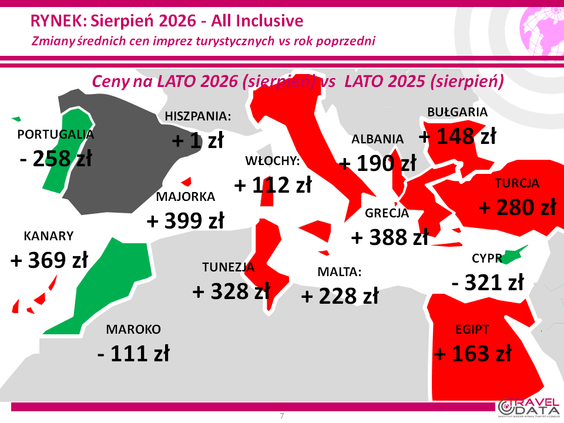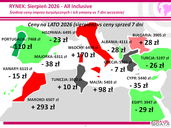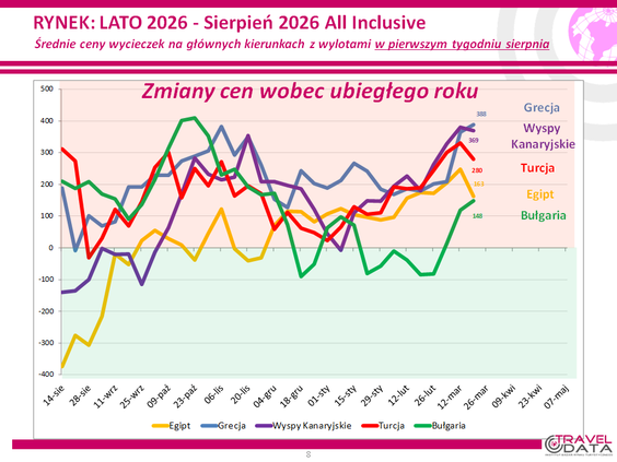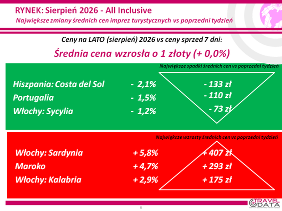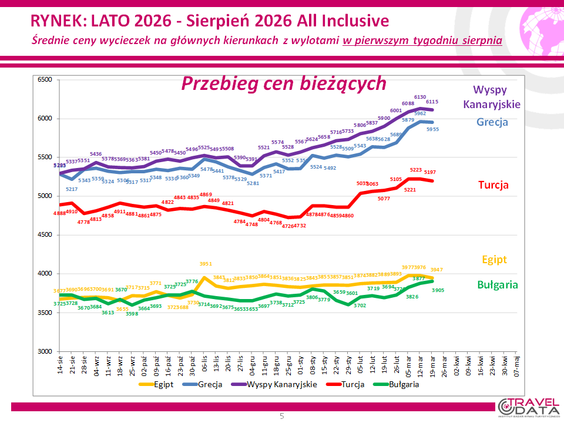 W minionym tygodniu średnia cena wycieczki z wylotem między 3 a 9 sierpnia 2026 roku wzrosła o złotówkę – czytamy w najnowszym raporcie Instytutu Badań Rynku Turystycznego Traveldata z przeglądu cen w biurach podróży*.