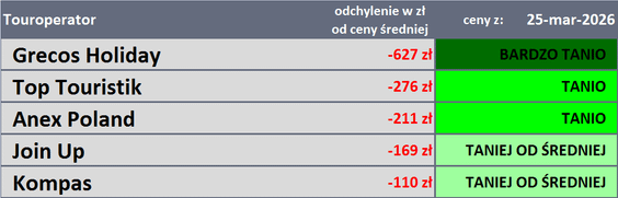 W kolejnej części materiału Traveldata zamieszcza tabelę z biurami podróży, które w ostatnim tygodniu oferowały imprezy turystyczne po cenach przekrojowo najkorzystniejszych. W składzie biur podróży w czołowej piątce nastąpiła jedna zmiana – do tabeli wszedł na pozycję piątą Kompas, a opuścił ją Onholidays. Na trzech pierwszych miejscach pozostawały Grecos, TOP Touristik i Anex Tour.