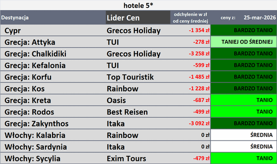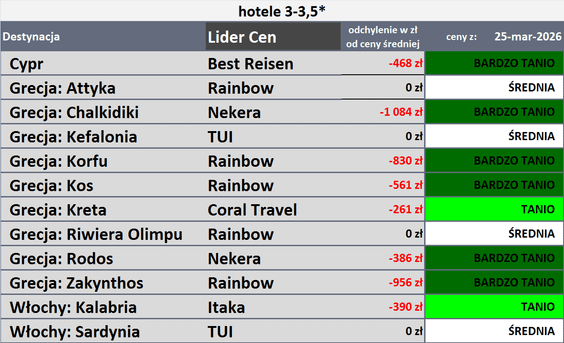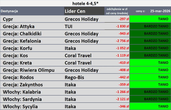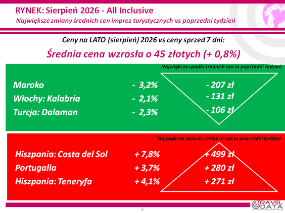 Na koniec autorzy zostawili tabele z touroperatorami, którzy oferowali w zeszłym tygodniu wyjazdy siedmiodniowe, all inclusive, z wylotem z Warszawy na pierwszy tydzień sierpnia 2026 roku z cenami najlepszymi dla klientów, czyli takimi, „których średnia oferowana cena jest najniższa względem średniej ceny wyjazdów do hoteli danej kategorii na danym kierunku”.
