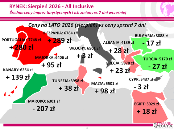 Ostatni tydzień zaznaczył się w biurach podróży kolejną podwyżką średnia cena wycieczki z wylotem między 3 a 9 sierpnia 2026 roku wzrosła o 45 złotych – podaje Instytutu Badań Rynku Turystycznego Traveldata w najnowszym raporcie*.