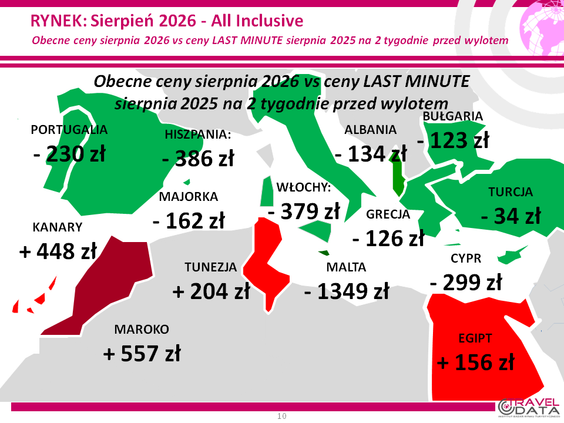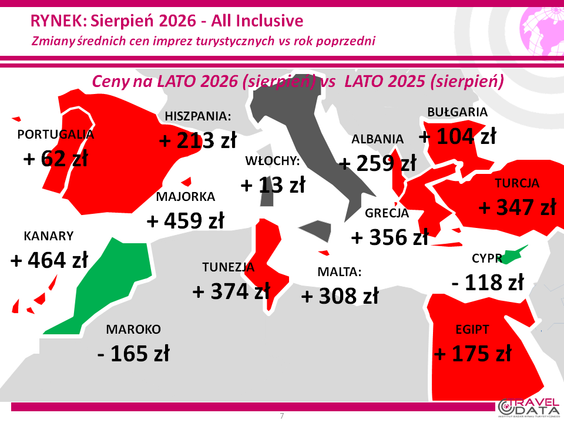 Jeśli chodzi o mniej uczęszczane kierunki, zwyżki cen wycieczek w ujęciu rok do roku odnotowano w wypadku Majorki, Tunezji, Malty, Albanii, Hiszpanii kontynentalnej, Portugalii i Włoch – o 459, 374, 308, 259, 213, 62 i 13 złotych. Spadki cen wyjazdów zanotowano natomiast w Maroku i na Cyprze – o 165 i 118 złotych - czytamy.