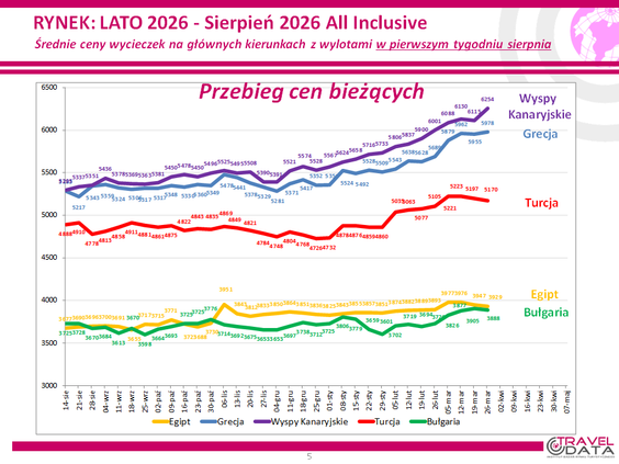 W ten sposób padły dwa nowe rekordy, Wyspy Kanaryjskie kosztowały już średnio 6254 złotych, a Grecja 5978 złotych. Z pojedynczymi wahnięciami te dwa kierunki najbardziej od tygodni wyznaczają sobie nowe maksymalne pułapy.