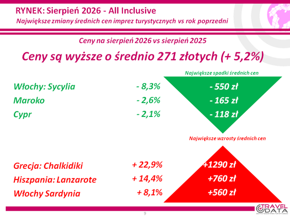 Największe roczne zwyżki cen wycieczek w nowym sezonie eksperci z Traveldaty ujawnili w wypadku Półwyspu Chalcydyckiego i było to 1290 złotych, oraz na Lanzarote i Sardynii – o 760 i 560 złotych. Z kolei największe roczne spadki cen wyjazdów odnotowali w odniesieniu do wyjazdu z biurem podróży na Sycylię, o 550 złotych, do Maroka, o 165 złotych, i na Cypr – o 118 złotych.