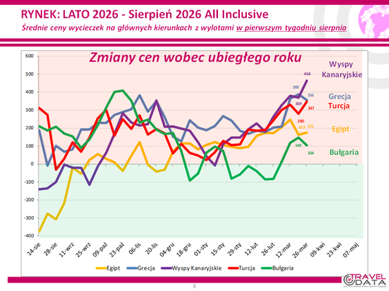 *Opracowanie obejmuje porównanie cen wyjazdów z wylotem w wysokim sezonie letnim 2026 roku, definiowanym na potrzeby porównań jako okres pierwszego tygodnia sierpnia, czyli od 3 do 9 sierpnia. Ceny dla tego okresu zostały zebrane 25 marca lutego 2026 roku i porównane z cenami dla tego samego okresu wylotów zebranymi 18 marca 2026 roku – w ujęciu tydzień do tygodnia – i z cenami zebranymi 27 marca 2025 roku w ujęciu rok do roku.