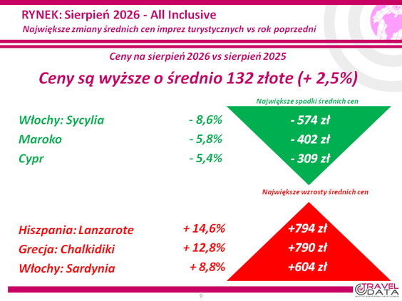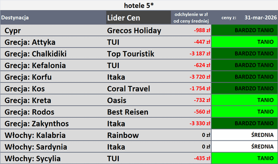 Raport zamykają trzy tabele z biurami podróży, które oferowały w zeszłym tygodniu wyjazdy siedmiodniowe, all inclusive, z wylotem z Warszawy na pierwszy tydzień sierpnia 2026 roku z cenami najlepszymi dla klientów, czyli takimi, „których średnia oferowana cena jest najniższa względem średniej ceny wyjazdów do hoteli danej kategorii na danym kierunku”.