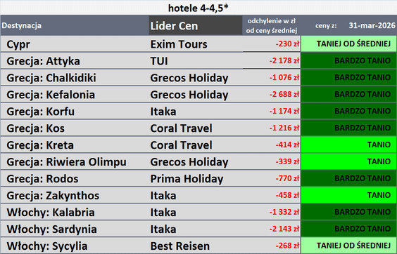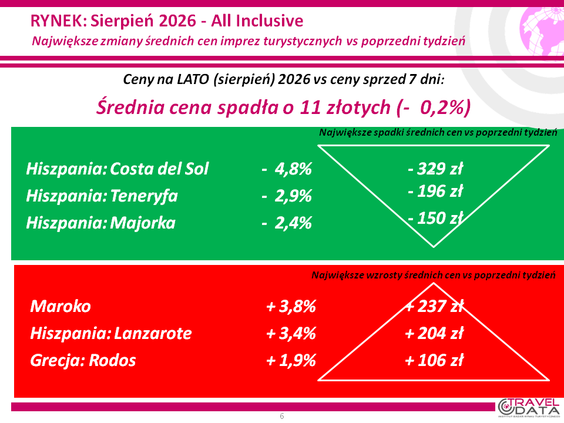 Eksperci Traveldaty ustalili, że najwięcej najtańszych wyjazdów wakacyjnych do Egiptu proponowały w ostatnim tygodniu biura Join Up (9) i Anex Tour (5), do Grecji Itaka (8), Grecos, Rainbow i TOP Touristik (po 5), na Wyspy Kanaryjskie TUI Poland (10) i Itaka (6), do Turcji Anex Tour (8) i Itaka (4), do Tunezji Anex Tour (6) i Join Up (4), a do Bułgarii Best Reisen i TOP Touristik (po 2 oferty).