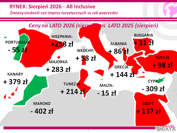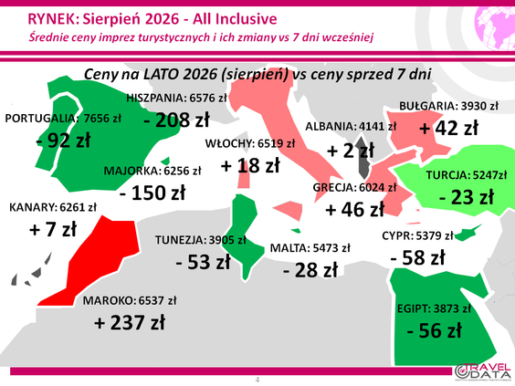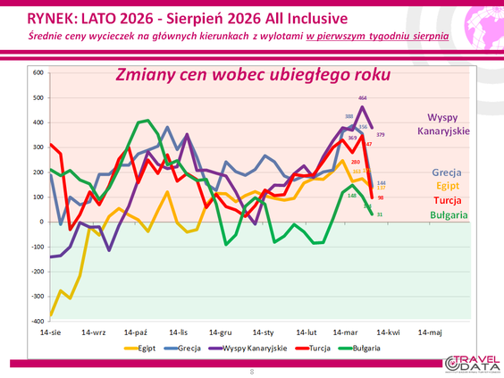W minionym tygodniu wszystkie pięć najważniejszych kierunków wyjazdów wypoczynkowych Polaków było droższych. W tym większe na Wyspach Kanaryjskich, w Grecji i Egipcie – o 379, 144 i 137 złotych, a mniejsze w Turcji i Bułgarii – o 98 i 31 złotych.
