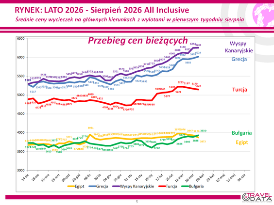Co ciekawe takie zmiany doprowadziły do tego, że trzy kierunki z tych najpopularniejszych, Wyspy Kanaryjskie, Grecja i Bułgaria, zanotowały kolejny raz rekordowe średnie ceny. W wypadku Wysp Kanaryjskich to już 6261 złotych, jeśli chodzi o Grecję, to 6024 (przekroczona pierwszy raz bariera 6000 złotych!), a w wypadku Bułgarii suma 3930 złotych.