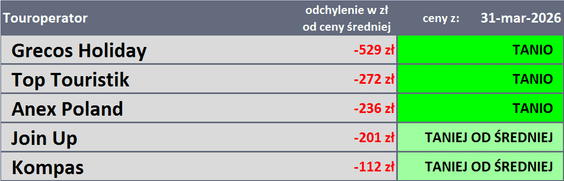 W następnej części materiału przedstawiają oni tabelę z biurami podróży, które w ostatnim tygodniu oferowały imprezy turystyczne po przekrojowo najkorzystniejszych cenach. Tym razem skład biur podróży w czołowej piątce nie uległ zmianie. Na trzech pierwszych miejscach znajdowały się ponownie Grecos, TOP Touristik i Anex Tour.
