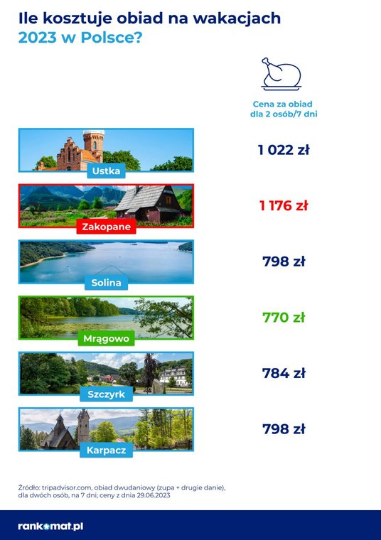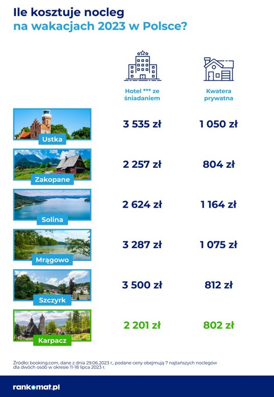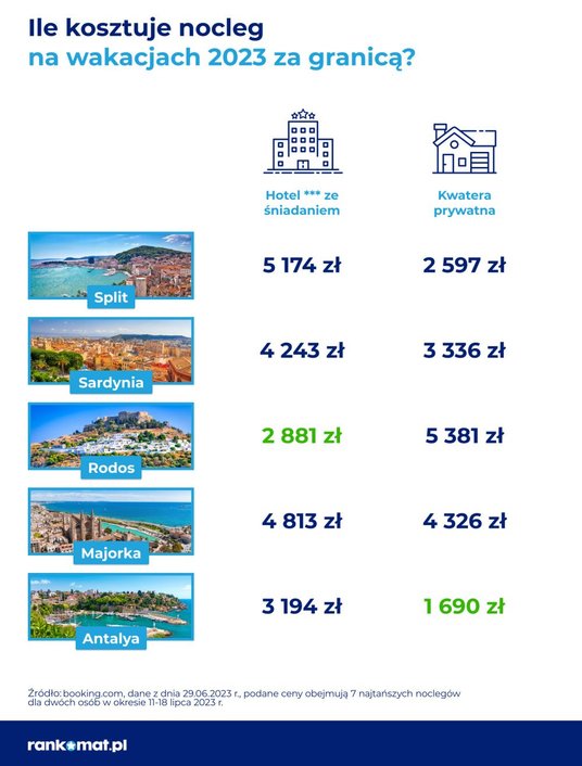 Multiporównywarka Rankomat.pl jak co roku sprawdziła, ile trzeba zapłacić za noclegi, jedzenie i transport w popularnych polskich kurortach nad morzem, na Mazurach i w górach oraz w pięciu najchętniej wybieranych przez klientów porównywarki wakacyjnych miejscach w Europie. Wyniki analizy opublikowała w informacji prasowej.