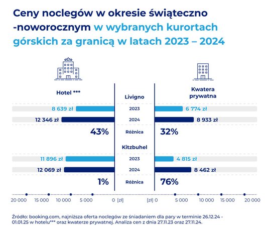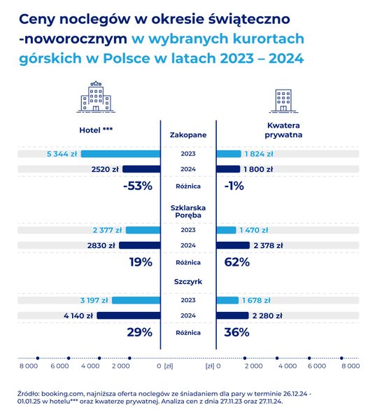 Eksperci porównywarki cen rankomat.pl sprawdzili, jak zmieniły się w ciągu roku ceny noclegów ze śniadaniem w polskich i zagranicznych kurortach górskich. Pod lupę wzięli ceny w okresie od 26 grudnia do 1 stycznia w hotelach trzygwiazdkowych i kwaterach prywatnych i porównali je rok do roku.