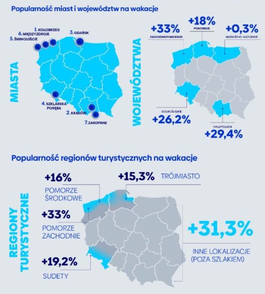 Turystów przyciąga przede wszystkim Bałtyk. Najpopularniejszym pod względem liczby rezerwacji regionem turystycznym jest Pomorze Zachodnie, do którego napłynęło 28 procent wszystkich rezerwacji (wzrost o 33 procent względem 2024 roku). Na drugim miejscu uplasowało się Pomorze Środkowe (wzrost o 16 procent), a na trzecim Sudety.