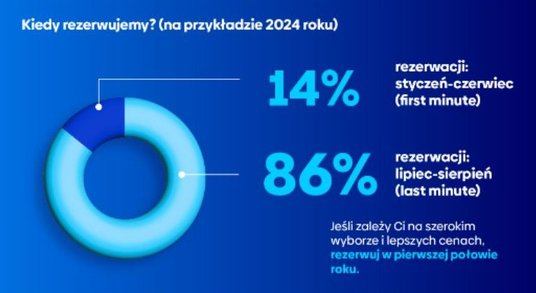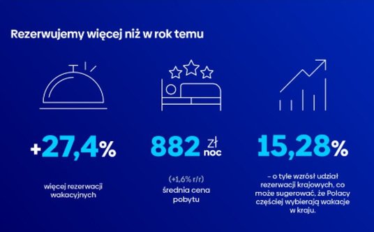 Liczba rezerwacji, które goście założyli na stronach internetowych hoteli między 1 stycznia a 10 marca 2025 roku na okres od 20 czerwca do 31 sierpnia jest o 27,4 procent większa niż w tym samym okresie rok temu. O 25,4 procent wzrosła również liczba zarezerwowanych noclegów (tak zwanych pokojonocy). Jednocześnie koszty pobytu w hotelach pozostały niemal niezmienione. Średnia cena za nocleg wyniosła 882 złote brutto, a to tylko o 1,6 procent więcej w porównaniu z rokiem ubiegłym.