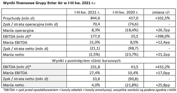 W samym trzecim kwartale tego roku wyniki przewoźnika "były zgodne z założeniami spółki i pozwoliły znacząco odrobić straty" poniesione w pierwszym półroczu 2021 roku. Spółka miała 536,9 mln złotych przychodów (184 procent, licząc rok do roku) i 75,6 miliona złotych zysku netto (120 procent).
