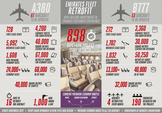Linie lotnicze Emirates rozpoczną w listopadzie modernizację wnętrz kabin 120 airbusów A380 i boeingów 777, dwóch największych samolotów komercyjnych będących obecnie w eksploatacji - informuje w komunikacie biuro prasowe przewoźnika.