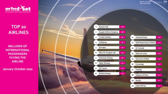 Zgodnie z raportem opublikowanym przez agencję badawczą ds. sprzedaży detalicznej podróży m1nd-set, we współpracy z Międzynarodowym Zrzeszeniem Przewoźników Powietrznych (IATA) i dostawcą danych o ruchu lotniczym ARC, który pokazuje kraje o największym ruchu lotniczym, Polska zajęła 13. miejsce wśród 20 krajów, które odnotowały co najmniej 15 milionów podróży międzynarodowych w 2022 roku. Jej wynik to 19 milionów przewiezionych pasażerów.