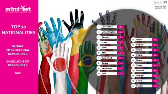 Trzy pierwsze kraje to Stany Zjednoczone ze 132 milionami, Wielka Brytania ze 102 milionami pasażerów na pokładach i Niemcy z 87 milionami podróży międzynarodowych w zeszłym roku. Poza nimi w pierwszej dziesiątce znalazły się jeszcze Francja, Hiszpania, Włochy, Szwajcaria, Kanada, Holandia i Indie. Przy czym Szwajcaria, Kanada i Holandia znalazły się na liście pierwszy raz, a Indie spadły na dziesiąte miejsce z miejsca piątego w 2019 roku. Z kolei z tej grupy wypadły Korea Południowa, Japonia i Chiny – odnotowuje raport.