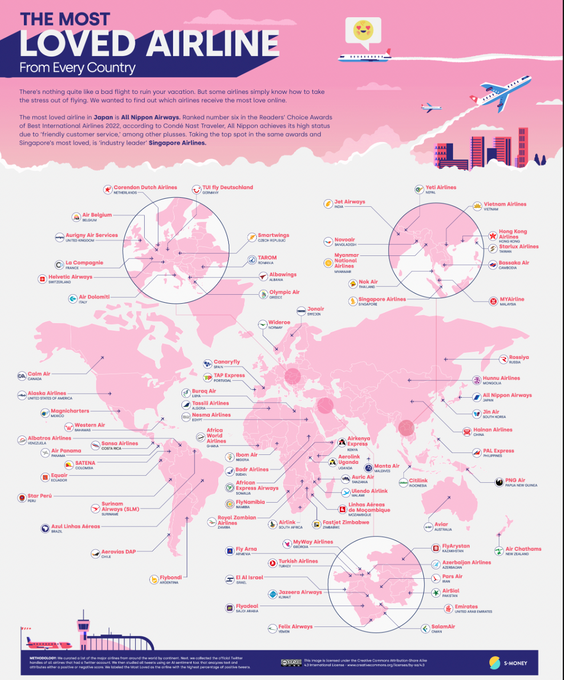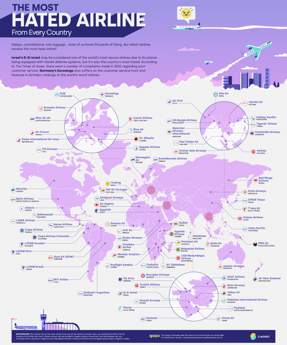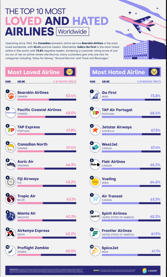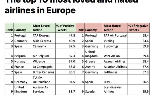 Australijska firma, zajmująca się wymianą walut, S Money Australia, sporządziła listę najbardziej znienawidzonych i najbardziej lubianych linii lotniczych na świecie ("The Most Loved and Hated Airlines From Every Country"). W swoim badaniu wzięła pod uwagę firmy obsługujące regularne loty i zarazem prowadzące konta na Twitterze. Za pomocą sztucznej inteligencji posegregowała wszystkie tweety, dzieląc je na te, które zawierały pozytywne i te negatywne określenia (badanie przeprowadziła w grudniu 2022 r.). Na koniec wyłączyła z analizy linie z mniej niż stoma wzmiankami. „Uznaliśmy, że najbardziej lubiane są linie lotnicze z najwyższym odsetkiem pozytywnych tweetów, a najbardziej znienawidzone te, które mają najwięcej negatywnych wpisów” - wyjaśnia.