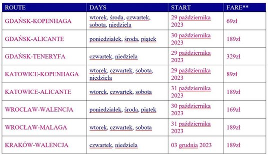 W sezonie zimowym Wizz Air zacznie latać z Gdańska do Kopenhagi, Alicante i na Teneryfę, z Katowic do Kopenhagi i Alicante, z Wrocławia do Walencji i Malagi oraz z Krakowa do Walencji. Nowe połączenia realizowane będą przez cały rok.