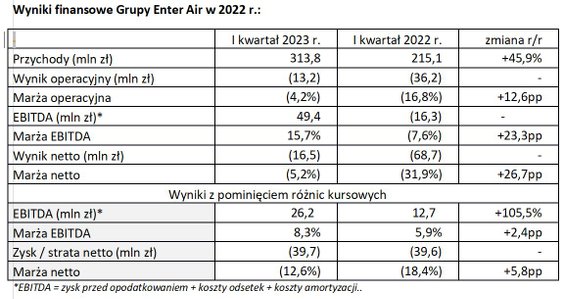 Enter Air zanotował 13,2 mln złotych straty operacyjnej, co oznacza lepszy wynik o prawie 23 mln złotych w porównaniu z 36,2 mln złotych straty operacyjnej rok wcześniej. Grupa wypracowała 49,4 mln złotych EBITDA i miała 16,5 mln złotych straty netto w porównaniu z 16,3 mln złotych straty EBITDA i 68,7 mln złotych straty netto w I kwartale 2022 r. "Na prezentowane wyniki wpływ miały dodatnie różnice kursowe, które wyniosły w I kwartale 2023 r. 23,2 mln zł. Bez uwzględniania różnic kursowych Enter Air miał 26,2 mln zł EBITDA oraz 39,7 mln zł straty netto" - czytamy.