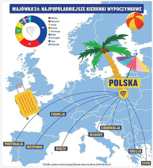 Włochy, Hiszpania i Grecja to kierunki, które najczęściej wybierają klienci Ryanaira w czasie majówki - podaje przewoźnik w komunikacie, powołując się na dane ze swojego systemu rezerwacyjnego za okres od 26 kwietnia do 6 maja.