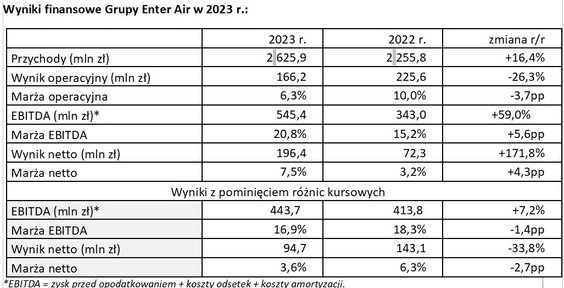 EBITDA Grupy w 2023 roku osiągnęła rekordowy w historii Grupy poziom 545,4 miliona złotych i była o 59 procent wyższa, porównując rok do roku. Zysku netto wzrósł o 171,8 procent do 196,4 miliona złotych. Na wyniki wpływ miały dodatnie różnice kursów walut, które dały w 2023 roku 101,7 miliona złotych. Bez uwzględniania różnic kursowych Enter Air miał 443,7 miliona złotych EBITDA i 94,7 miliona złotych zysku netto – odnotowuje spółka w komunikacie prasowym.