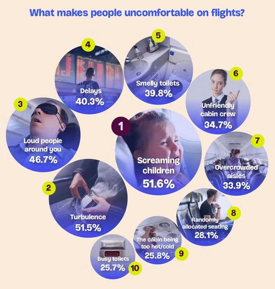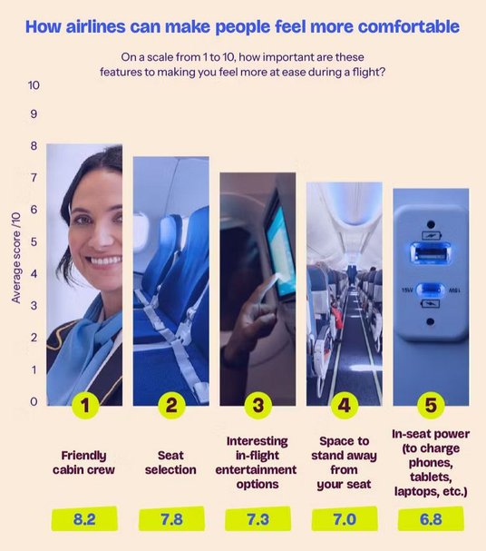 Co może sprawić, że podróż lotnicza będzie bardziej komfortowa? - zapytał Bounce ankietowanych. Ich zdaniem najważniejsza jest przyjazna załoga. Na kolejnych miejscach znalazły się możliwość wyboru miejsca, ciekawa rozrywka pokładowa, miejsce do stania z dala od siedzenia, fotele wyposażone w gniazda zasilania (do ładowania telefonów, tabletów, laptopów itp.), wiele opcji posiłków, dostępność wi-fi, zestaw przydatnych rzeczy (przybory toaletowe, maski na oczy, zatyczki do uszu itp.), słuchawki z redukcją szumów, poduszki i koce oraz specjalne programy relaksacyjne w menu rozrywki pokładowej.