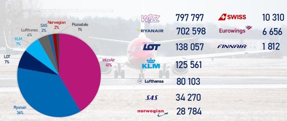 Letni rozkład lotów 2021 roku liczył 93 połączenia, do 23 państw, na 77 lotnisk, w tym na sześć w Polsce, realizowanych przez 10 przewoźników: Wizz Air, Ryanair, LOT, SAS, KLM, Lufthansa, Eurowings, Finnair, Swiss i Norwegian.