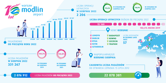 Wysoki wzrost odnotowano też w porównaniu z sierpniem 2021 roku 150,8 procent obsłużonych pasażerów.