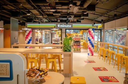 Obok kawiarni So Coffee na antresoli działa natomiast punkt gastronomiczny 1Minute Smacznego! wzorowany na food trucku, z położoną centralnie otwartą kuchnią, w której na oczach klientów przygotowywane są szybkie posiłki, takie jak pizza, kanapki, frytki, hot-dogi. Poza jedzeniem szykowanym na miejscu pasażerowie mogą też kupić gotowe produkty typu „grab-and-go” i kawę.