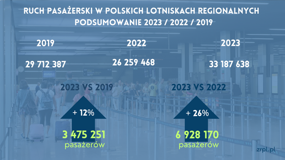 ZRPL policzył, że porównując do wcześniejszego rekordu z 2019 roku, gdy obsłużono 29,7 miliona pasażerów, liczba podróżnych w minionym roku wzrosła w portach regionalnych o 12 procent, a w stosunku do 2022 roku, kiedy obsłużono 26,3 miliona pasażerów o 26 procent. Z kolei Lotnisko Chopina miało nieco większą dynamikę, bo ponad 28-procentową.