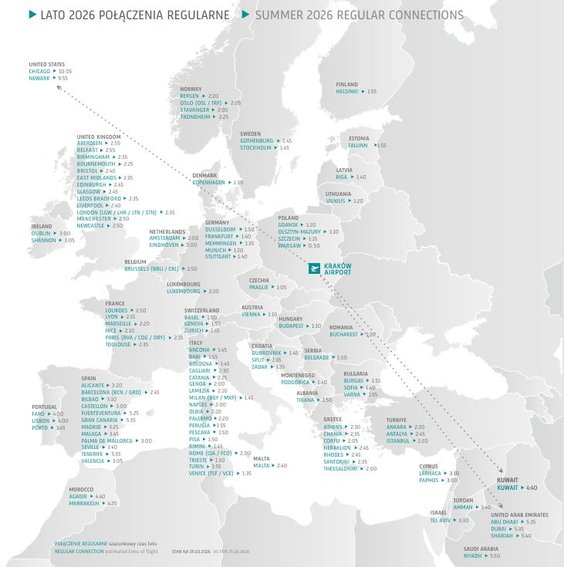 Wśród nowości w sezonie Lato 2026 znalazły się liczne kierunki oferowane przez przewoźników współpracujących z Kraków Airport. LOT uruchomi połączenia do Rzymu, Barcelony, Madrytu i Gdańska. Wizz Air wzbogaci swoją ofertę o loty do Budapesztu, Wenecji i na Rodos, a Ryanair zaproponuje rejsy do Budapesztu.