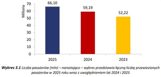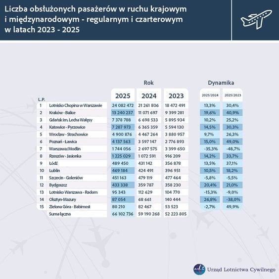 W 2025 roku polskie porty lotnicze obsłużyły 66,1 miliona pasażerów – o 11,7 procent ( 5,7 miliona) więcej w porównaniu z rokiem 2024.