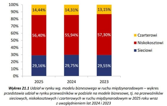 - w 2025 roku doszło do nieznacznej zmiany struktury udziałów w ruchu międzynarodowym ze względu na model biznesowy przewoźnika lotniczego. Ponieważ przewoźnicy sieciowi odnotowali wzrost w liczbie przewożonych pasażerów o 10,2 procent, przewoźnicy niskokosztowi o 13,4 procent, a przewoźnicy czarterowi o 13,5 procent, spadł udział w rynku przewoźników sieciowych (o 0,6 punktu procentowego), wzrósł natomiast udział przewoźników niskokosztowych i czarterowych (odpowiednio o 0,5 i 0,1 punktu procentowego).