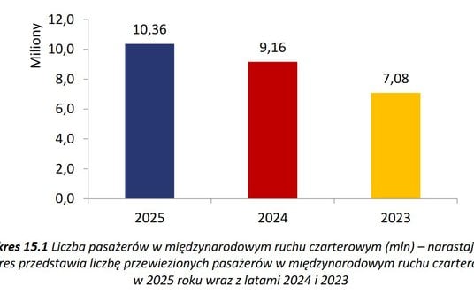 Prawie co szósty pasażer korzystający z polskiego lotniska był klientem biura podróży, czyli wsiadał do samolotu czarterowanego przez jakiegoś organizatora turystyki. Na trasach międzynarodowych obsłużono dzięki temu 10,4 miliona pasażerów, co oznaczało wzrost o 13,1 procent (1,2 miliona więcej niż w 2024 roku).