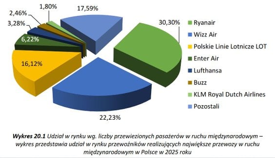 „Wśród portów lotniczych najwięcej pasażerów w międzynarodowym ruchu czarterowym w 2025 roku obsłużyło lotnisko Katowice w Pyrzowicach (3,7 mln), a kolejnymi pod względem liczby przewiezionych pasażerów portami lotniczymi były Lotnisko Chopina w Warszawie (2,7 mln), Port Lotniczy Poznań-Ławica (1,2 mln).