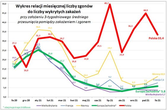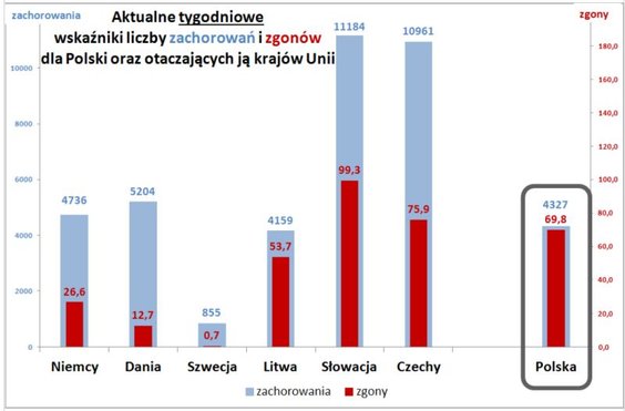Pod względem nowych zachorowań pozycja Polski w ostatnim tygodniu pozostała bez istotnych zmian, ale nastąpiła zmiana na niekorzyść pod względem liczby zgonów.
