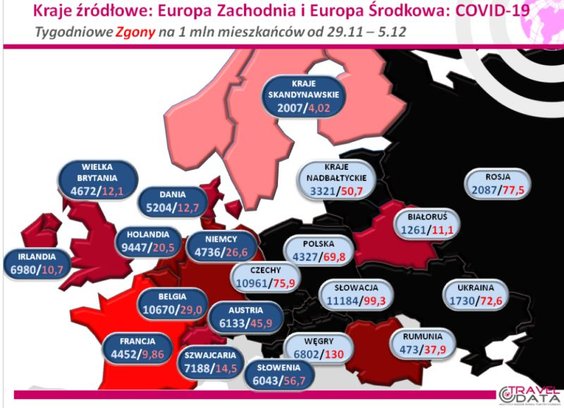W ostatnim tygodniu wskaźnik liczby zgonów dla Polski był już zaledwie 23. najniższym wśród krajów Unii Europejskiej, a w Europie wyprzedzała nas jeszcze Szwajcaria (14,4), Albania (8,45) i Norwegia (3,24). Mniejsza jego wartość miała miejsce również w krajach docelowych jak Maroko (0,28), Tunezja (2,97), Egipt (3,68) i Turcja (16,4).