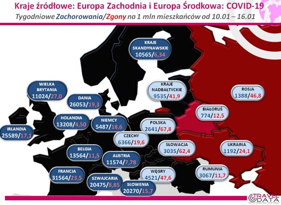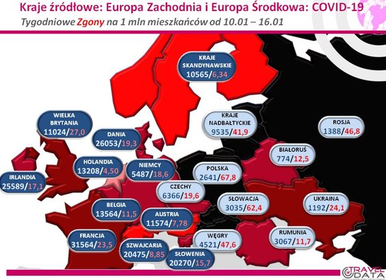 Wskaźnik zgonów w środkowej części Europy wyniósł 41,2 (przed tygodniem 41,9). To wyraźnie wyższy wskaźnik niż w zachodnioeuropejskich krajach źródłowych, w których ostatni odczyt wyniósł 18,9 (przed tygodniem 13,2).