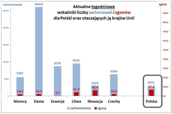 W Polsce po wcześniejszym dość istotnym spadku, w ostatnim tygodniu wzrost wskaźnika nowych zakażeń był mniejszy niż w Europie Środkowej jako całości i podniósł się z 2269 do 2641, czyli o około 16,4 procent i był czwartym najniższym w tej grupie 11 krajów.