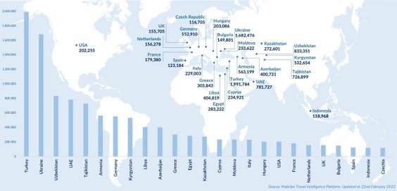 Krajem o największej liczbie regularnych lotów i miejsc w samolotach z Rosji jest Turcja. Daje to w sumie 1,99 miliona biletów na najbliższe sześć miesięcy. Dalej plasują się Ukraina (1,68 mln), Uzbekistan (833 tys.), Zjednoczone Emiraty Arabskie (782 tys.) i Tadżykistan (727 tys.).